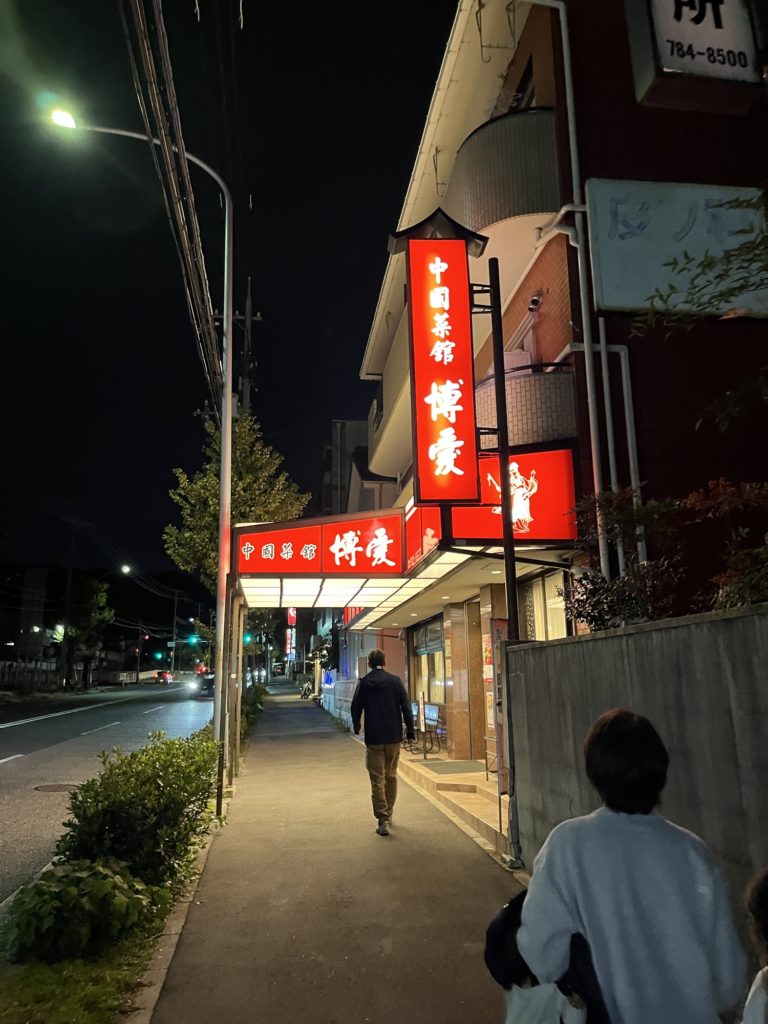 冬の神戸・舞子。 日が沈むのが早く、仕事が終わって外と少し夜の帳の中。 そんな平日のディナータイム、家族で評判の中華料理店「中華菜館博愛」に行ってきた。 場所は神戸市垂水区本多聞2丁目。 住宅街の一角にありながら、赤い看板が真っ暗に見えて、遠くからでもパッと目を引きます。