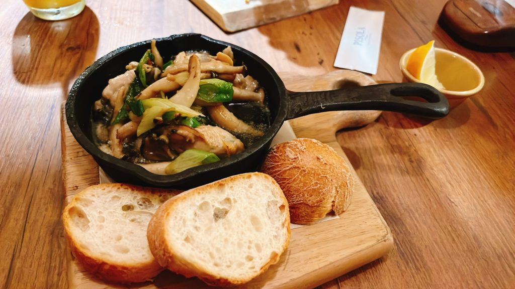 続いて登場したのは、サイドで注文した「牡蠣のアヒージョ バゲット添え」。