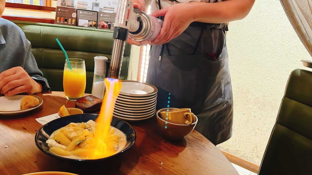 そして、ここでスタッフさんが目の前でチーズをバーナーで炙ってくれるんです。じゅわっと焦げる音とともに、席いっぱいに広がる香ばしいチーズの香り!