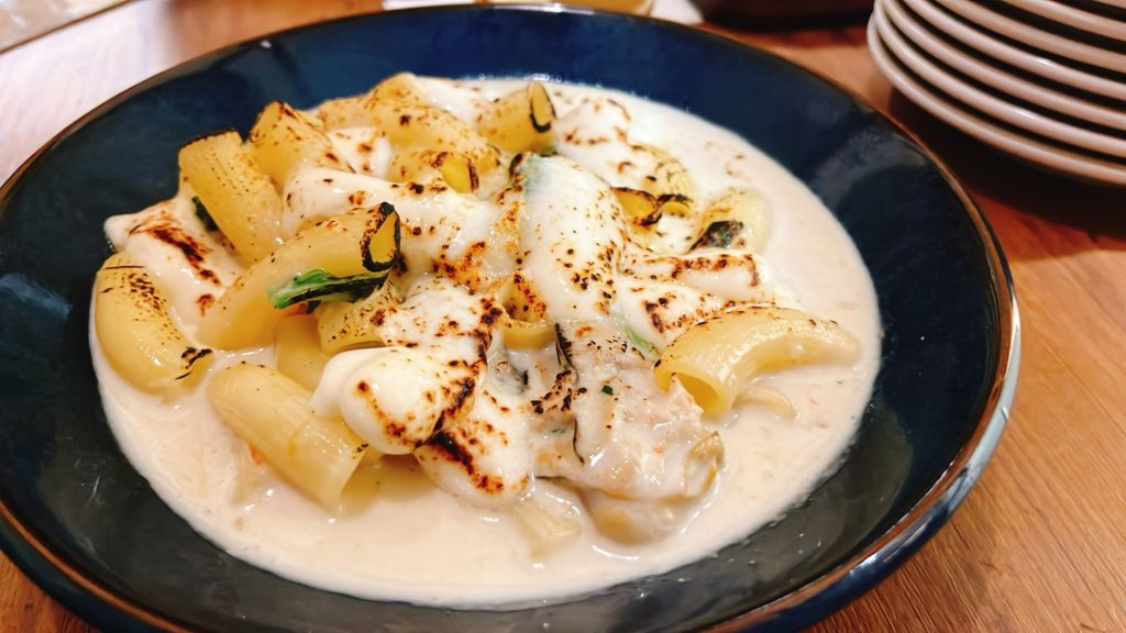 🦪「本ずわい蟹と牡蠣のリガトーニ 炙りモッツァレラのグラタン仕立て」