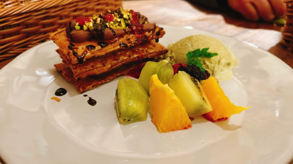 デザートは別途で「ピスタチオとベルギーチョコカスタードのミルフィーユパイ」(+878円)をシェアすることにしました。