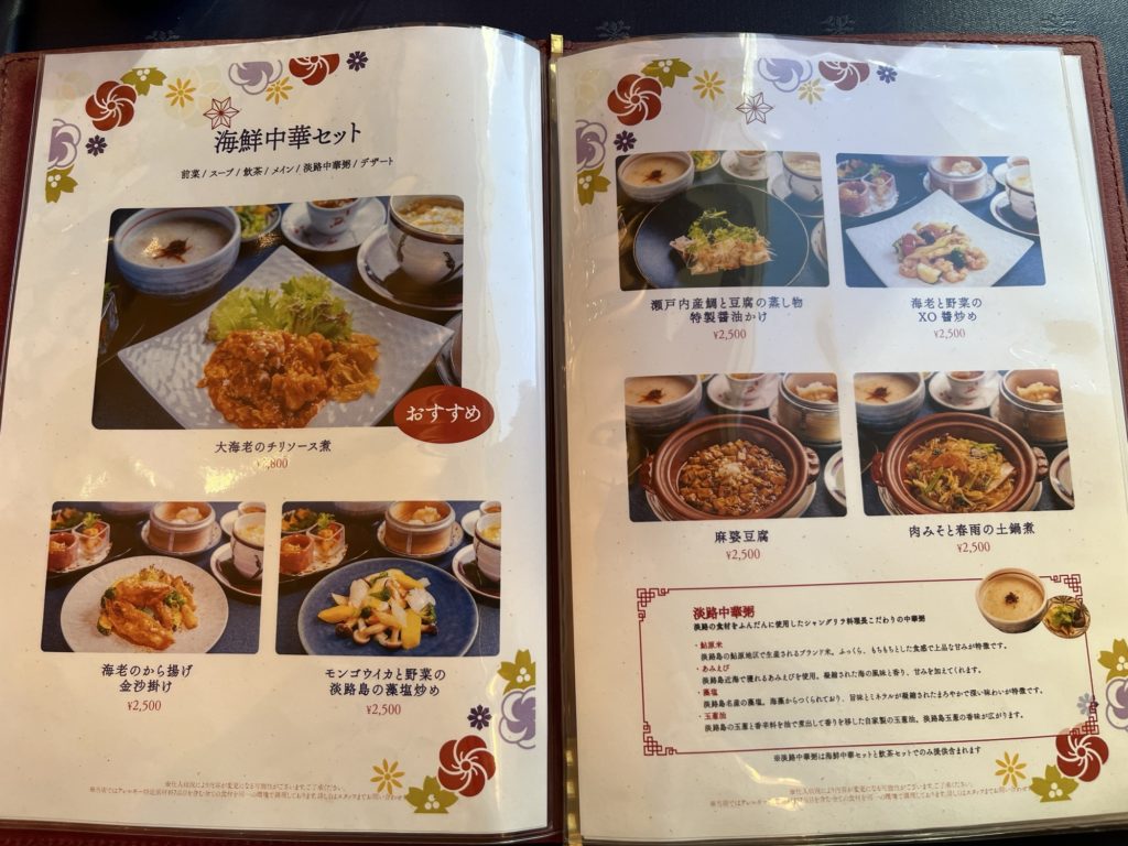 メニューを見ると、1人2000〜3000円前後のセットコースが中心。少しお高めではあるが、どれも見た目にも華やかで「淡路島で食べる上品な海鮮中華」という印象だ。