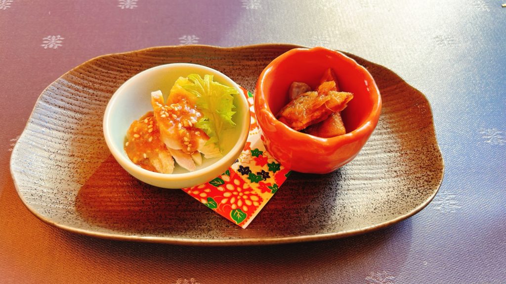 最初に運ばれてきた前菜は、鶏胸肉の味噌和えといわしの甘酢揚げ。