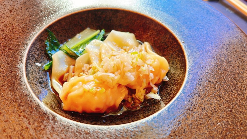 次に運ばれてきたのは水餃子。チンゲンサイが添えられ、やさしい出汁の香りがふわりと立ち上る。