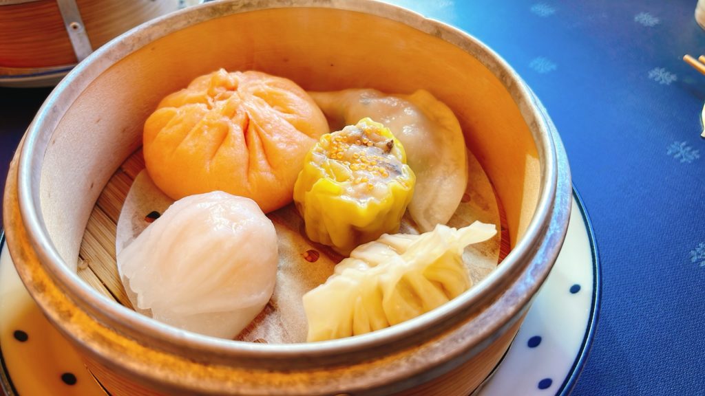 中には定番の海老餃子、蒸し餃子、シュウマイ、小さめの豚まんなどがぎっしり。どれも見た目が美しく、味も海鮮の風味がしっかり感じられる。特に海老餃子は皮が透き通るほど薄く、噛むと中から海老の甘みが広がる。