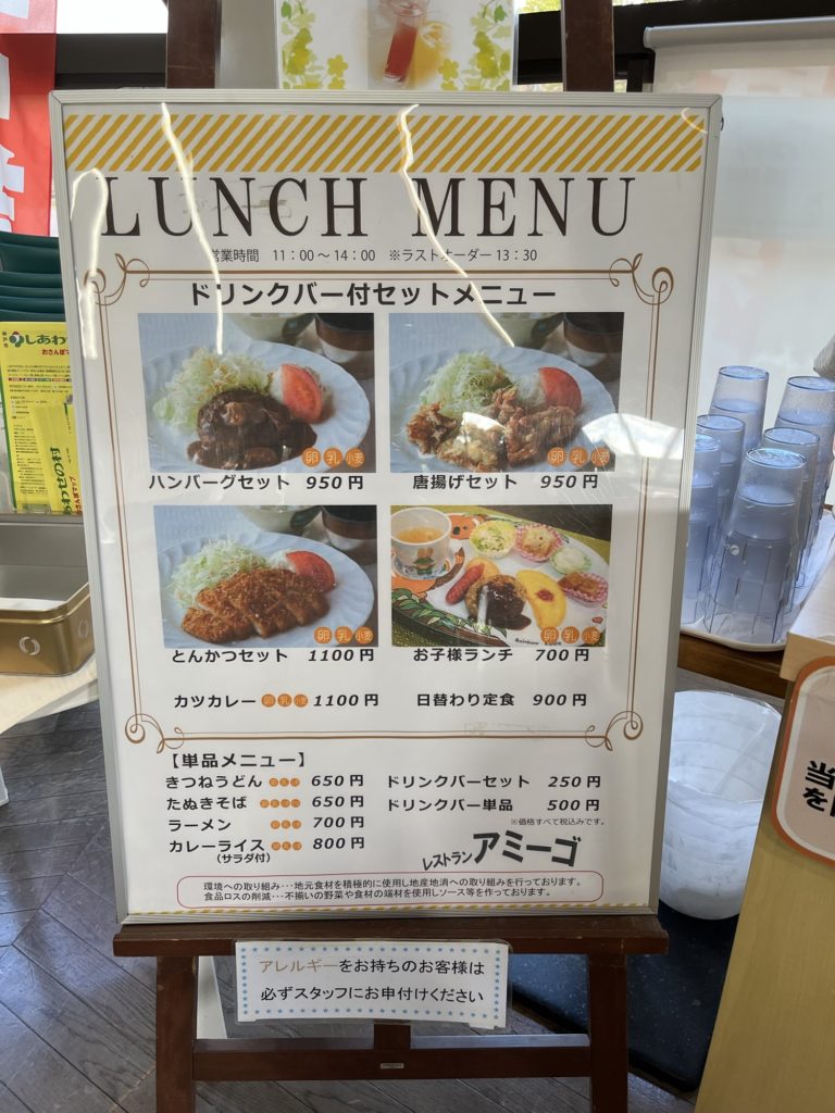 「アミーゴ」は、トリム園地エリアのすぐ横に位置しています。施設案内の看板にもはっきりと表示があり、アクセスしやすい場所にあります。通りに面した建物の前にはランチメニューの看板も出ており、初めてでもすぐ見つけられました。