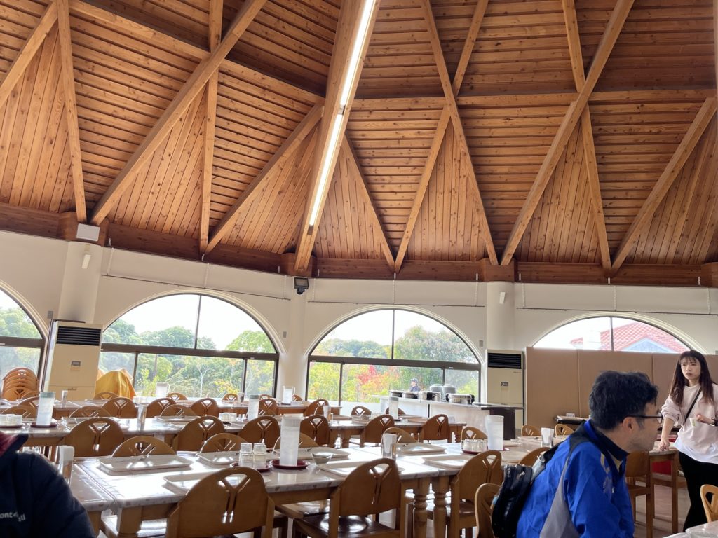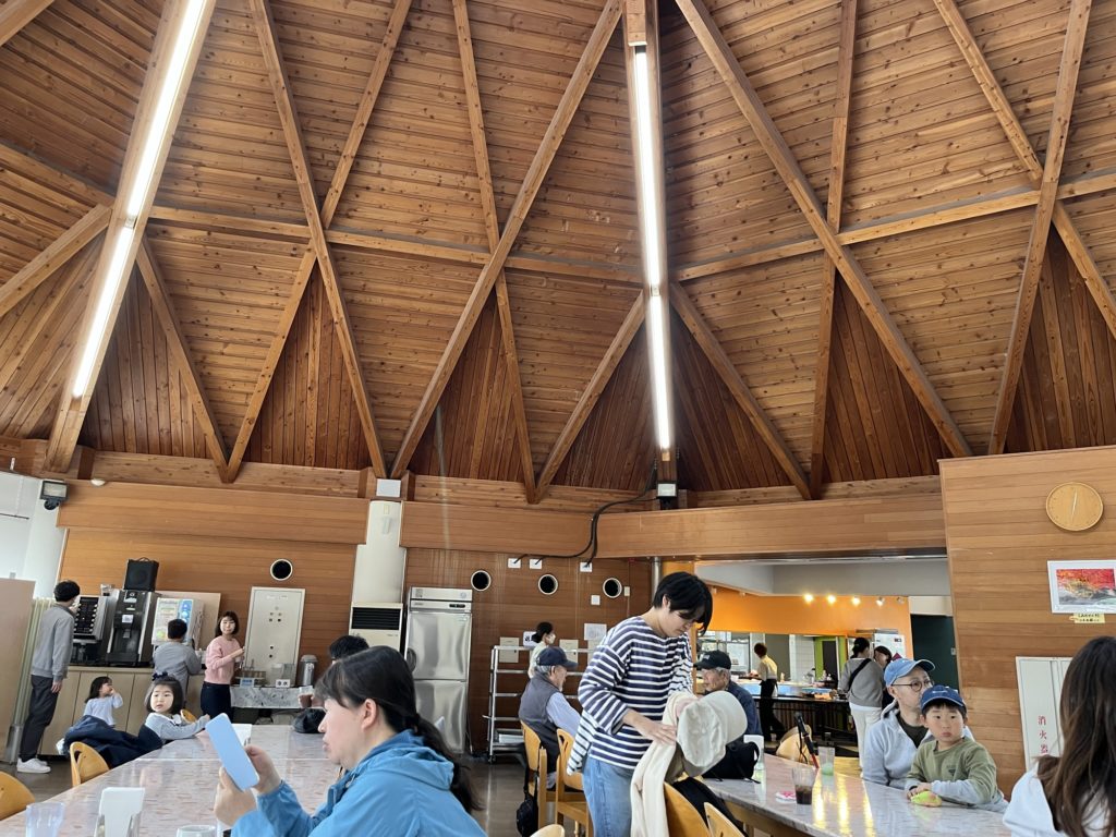 店内に入ると、天井が高く開放的で、全体的に広々とした空間。観光地の食堂というよりも、地域のカフェテリアに近い落ち着いた雰囲気です。テーブル席も多く、子ども連れの家族が何組か食事を楽しんでいました。