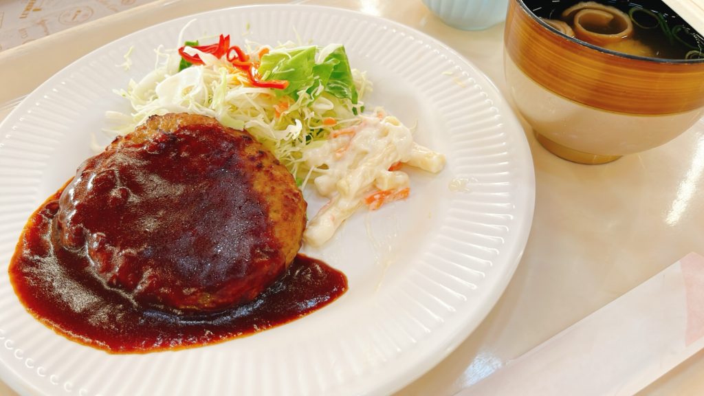 ハンバーグはふんわり柔らかめで、デミグラスソースもやや甘め。付け合わせのサラダはドレッシングがしっかり味が付いていて、全体的に家庭の食堂らしい雰囲気を楽しめます。