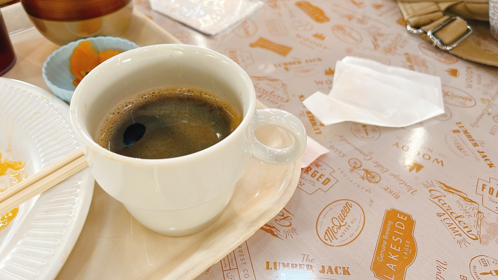 食後は、サービスのドリンクバーへ。紅茶やアイスコーヒー、カルピスジュースなど種類もまあまあ豊富。私はホットコーヒーを選び、一息つくことにしました。