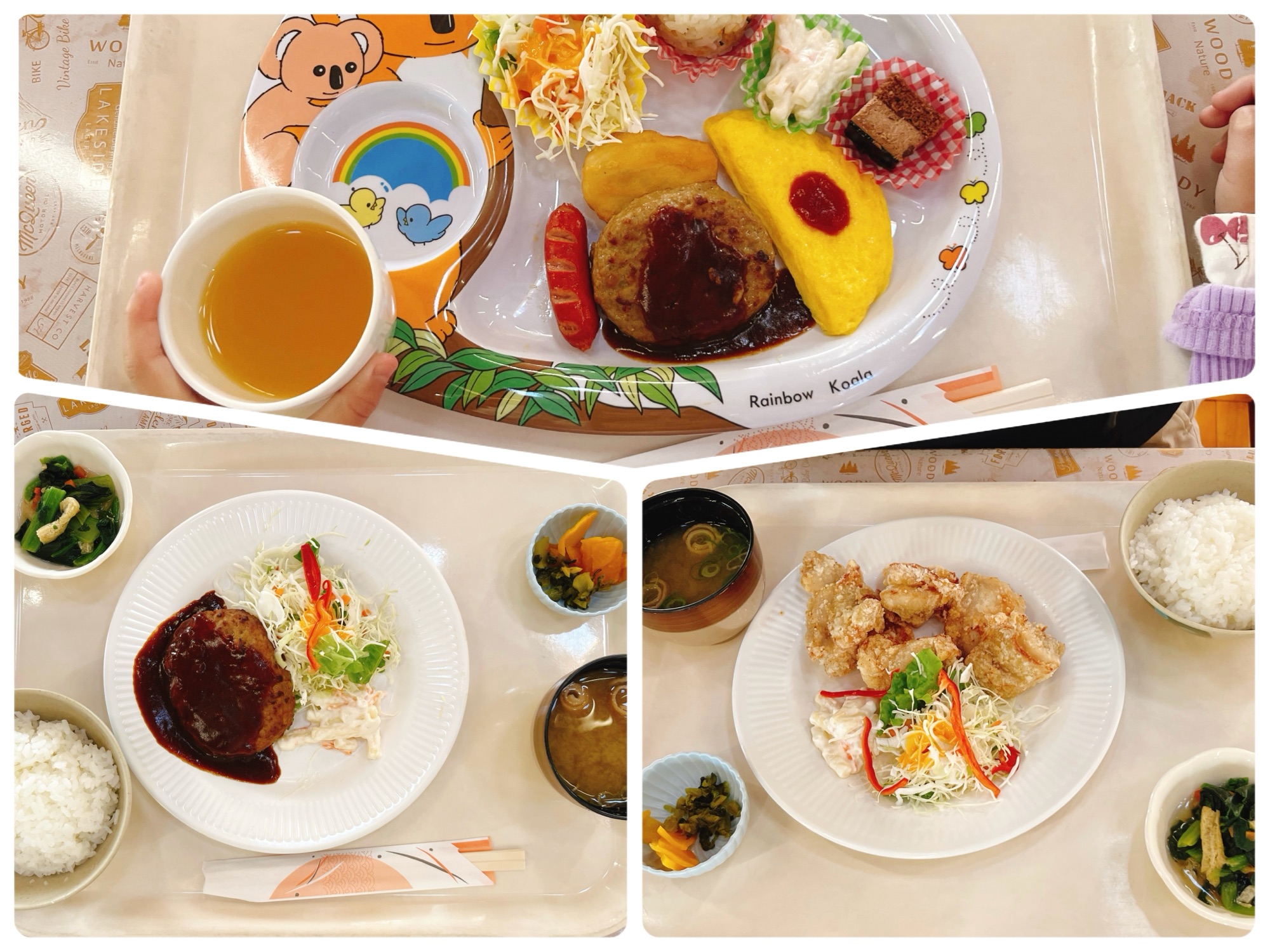 メインのハンバーグは鉄板ではなく皿盛りのスタイルで、ソースはデミグラス。添えられた野菜が家庭的な感じで、見た目も落ち着いています。祖父の唐揚げランチも同じく定食風で、どこか懐かしさのある雰囲気。