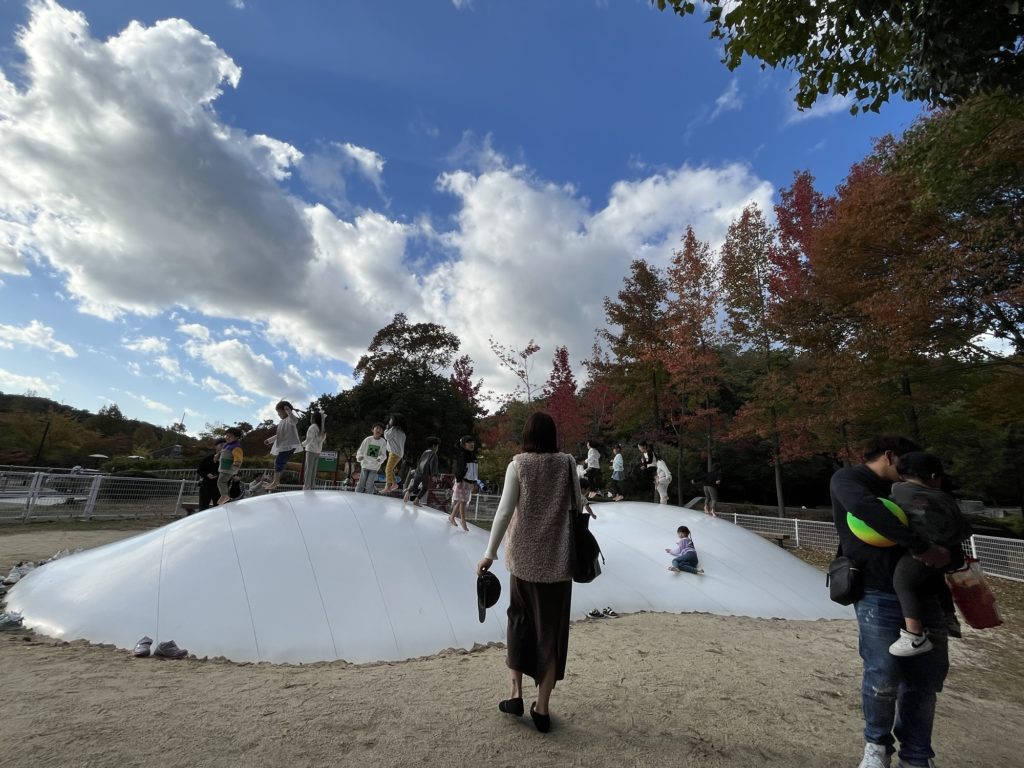 トリム園地には、木製の大型アスレチックや滑り台、ネット遊具などが並び、子どもたちが元気いっぱいに走り回っていました。午前中に来たときよりも少し賑やかになっていて、まるで公園フェスのようなにぎわい。